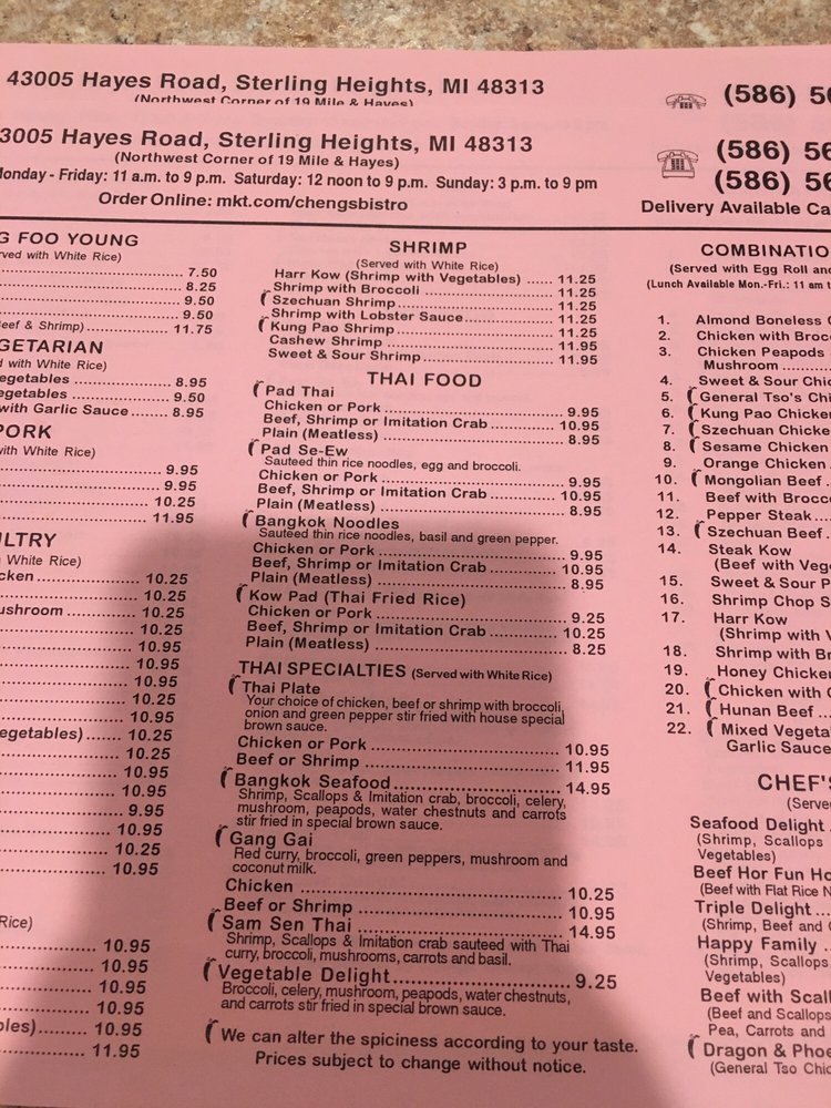 Cheng’s Asian Bistro in Sterling Heights, MI, offers a fusion of Thai and Chinese cuisine in a casual and quiet setting. The extensive menu includes vegan and vegetarian options, making it a great choice for those with dietary restrictions. With amenities like outdoor seating, free Wi-Fi, and happy hour specials, Cheng’s provides a comfortable dining experience for everyone. The restaurant is family-friendly, with options for both lunch and dinner, and offers catering for special events. Their dishes boast authentic flavors and fresh ingredients, served by attentive waitstaff. Whether you're looking for a group outing or a cozy meal for two, Cheng’s Asian Bistro is a versatile dining spot worth trying.